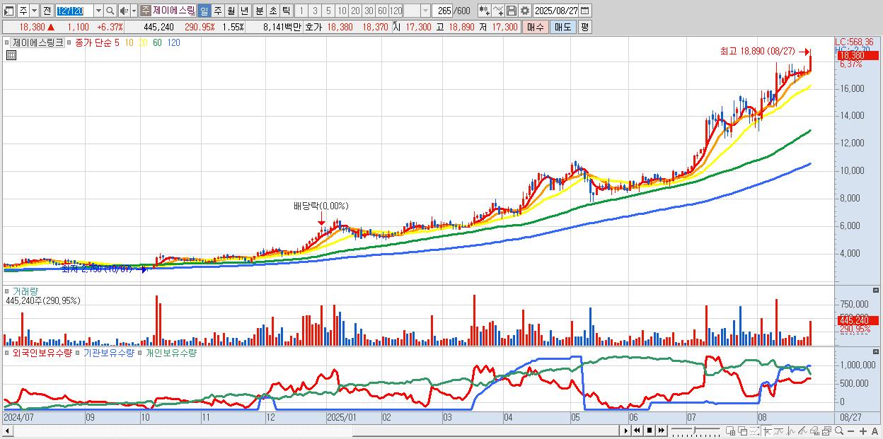 - 제이에스링크 (18,380원 ▲ 6.37% , 시총: 5,292억, 거래량: 445,240, 거래대금:81억, KOSDAQ)