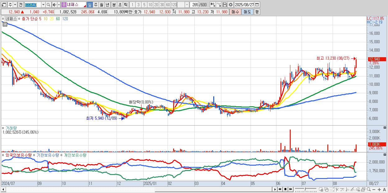 - 네패스 (12,940원 ▲ 8.74% , 시총: 2,984억, 거래량: 451,183, 거래대금:57억, KOSDAQ)