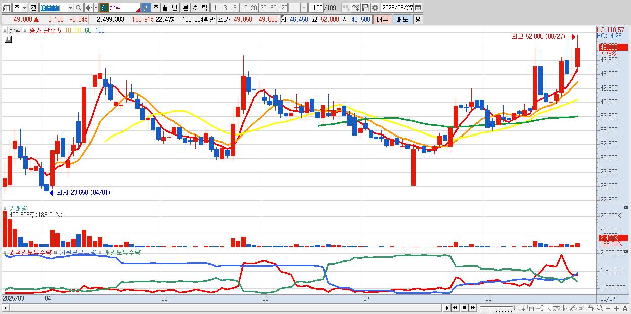 - 한텍 (49,900원 ▲ 6.85% , 시총: 5,549억, 거래량: 1,320,714, 거래대금:662억, KOSDAQ)
