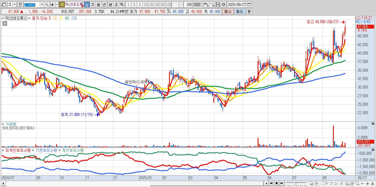 - 덕산네오룩스 (48,850원 ▲ 6.31% , 시총: 12,130억, 거래량: 651,929, 거래대금:314억, KOSDAQ)