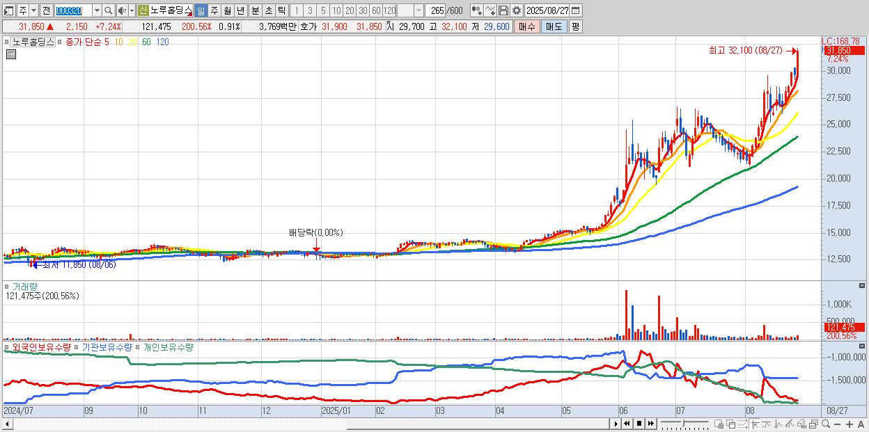 - 노루홀딩스 (31,800원 ▲ 7.07% , 시총: 4,227억, 거래량: 76,653, 거래대금:24억, KOSPI)