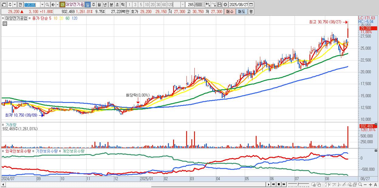 - 대양전기공업 (29,200원 ▲ 11.88% , 시총: 2,794억, 거래량: 932,469, 거래대금:272억, KOSDAQ)