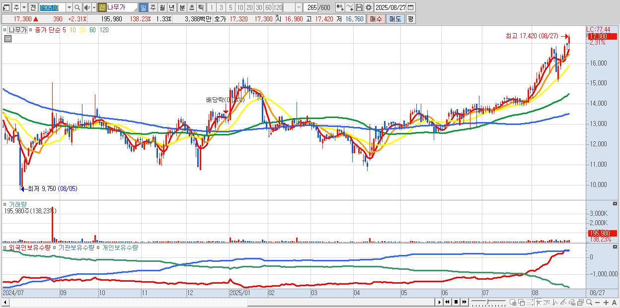 나무가 17,300원 ▲ 2.31% (KOSDAQ, 190510)