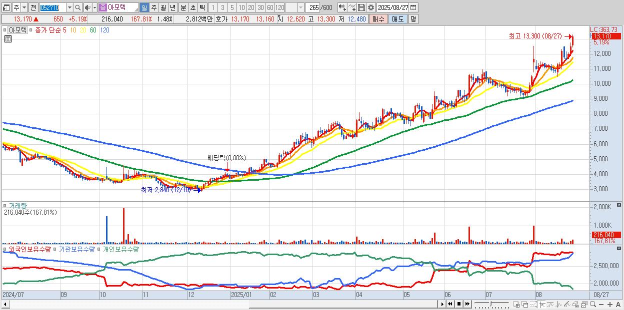 - 아모텍 (13,170원 ▲ 5.19% , 시총: 1,925억, 거래량: 216,040, 거래대금:28억, KOSDAQ)