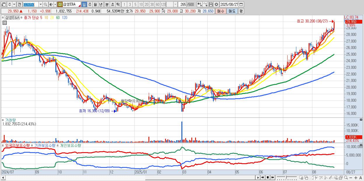 - 삼성E&A (30,000원 ▲ 4.17% , 시총: 58,800억, 거래량: 1,287,520, 거래대금:383억, KOSPI)