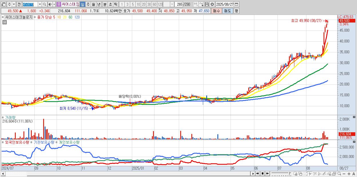 - 씨어스테크놀로지 (49,500원 ▲ 3.34% , 시총: 6,270억, 거래량: 216,604, 거래대금:106억, KOSDAQ)