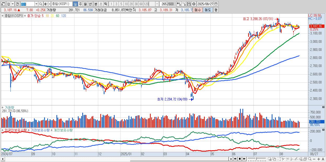 | 08/27 | 3,187.16 | ▲0.25% | 569억 | -2,023억 | 277억 | 1,177억 |