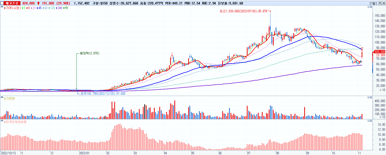 - 에코프로 (828,000원 ▲ 29.98% , 시총: 220,477억, 거래량: 1,152,682, 거래대금:8,963억)