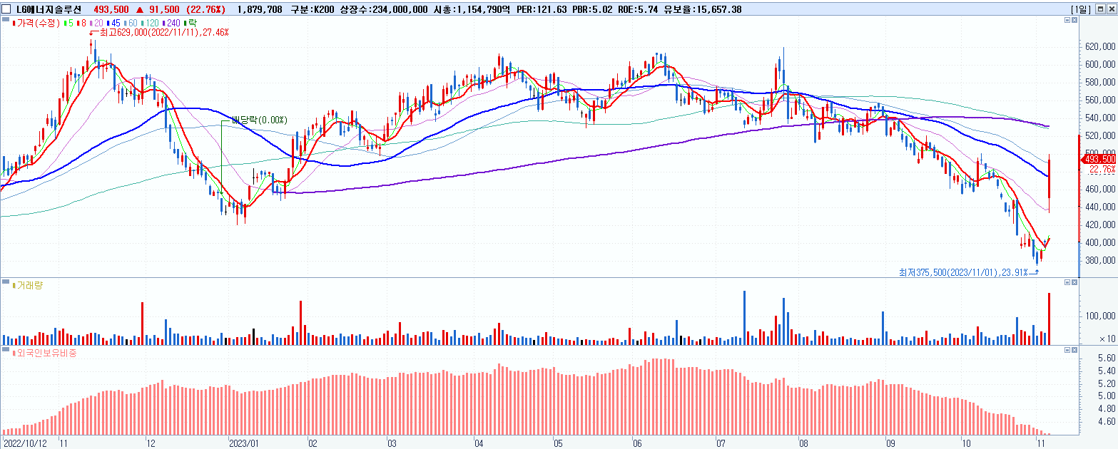 - LG에너지솔루션 (493,500원 ▲ 22.76% , 시총: 1,154,790억, 거래량: 1,885,829, 거래대금:8,939억)