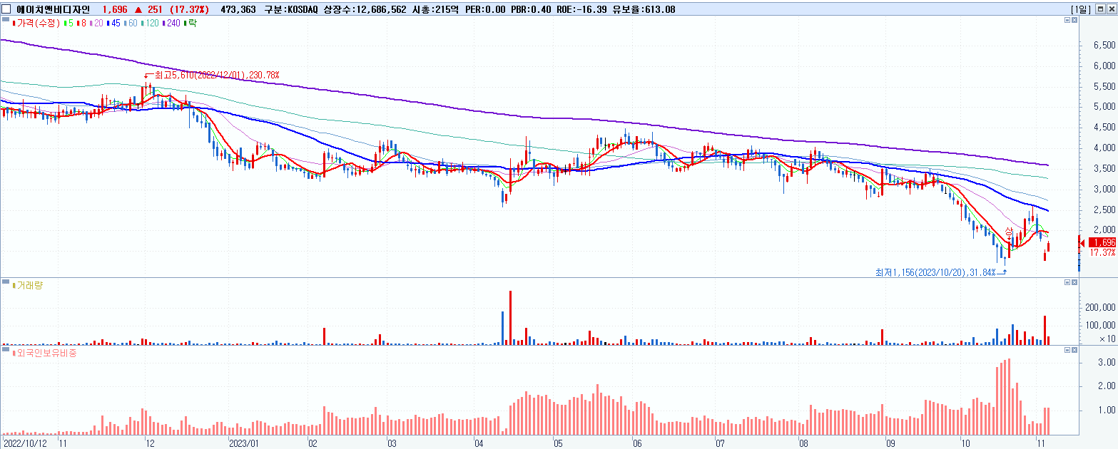 - 에이치앤비디자인 (1,696원 ▲ 17.37% , 시총: 215억, 거래량: 474,530, 거래대금:8억)