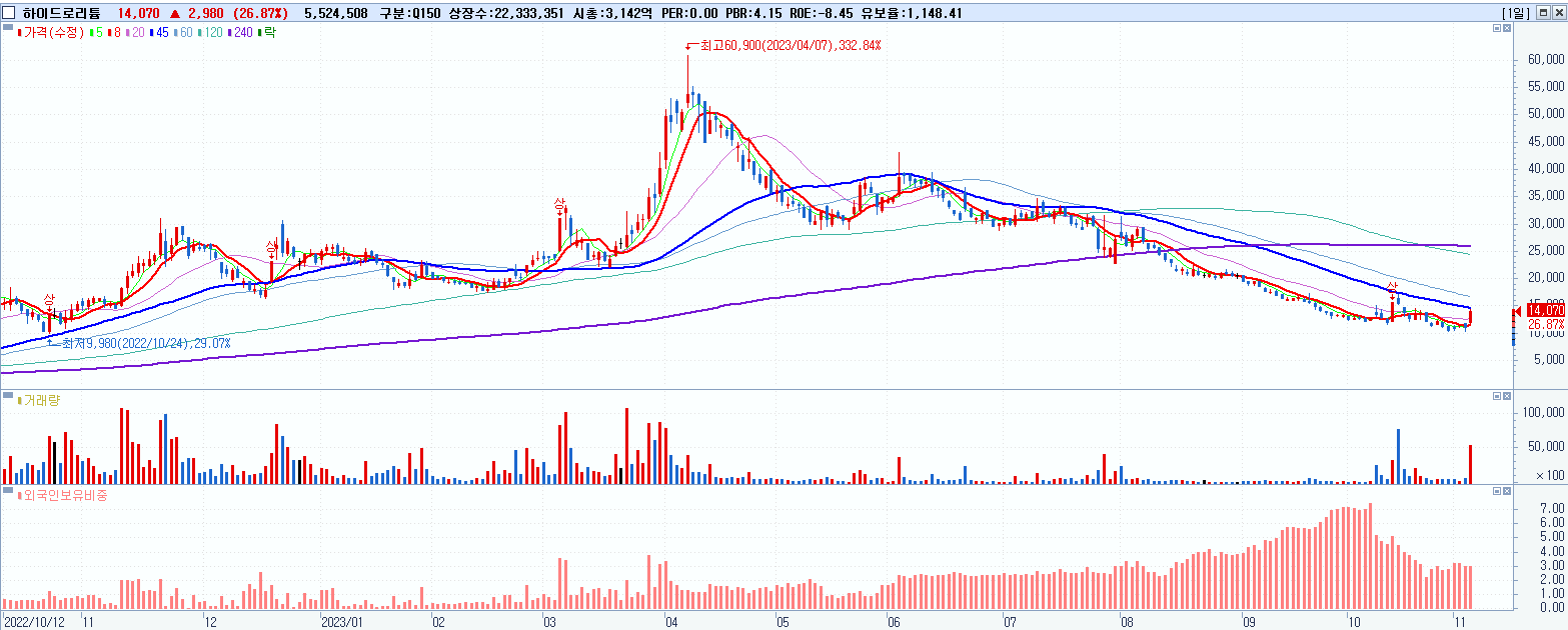 - 하이드로리튬 (14,070원 ▲ 26.87% , 시총: 3,142억, 거래량: 5,557,287, 거래대금:764억)