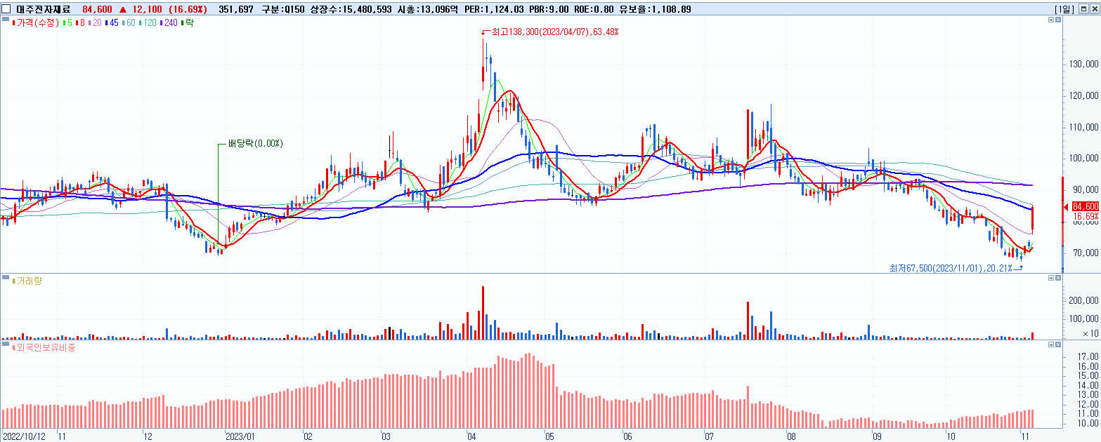 - 대주전자재료 (84,600원 ▲ 16.69% , 시총: 13,097억, 거래량: 352,784, 거래대금:288억)