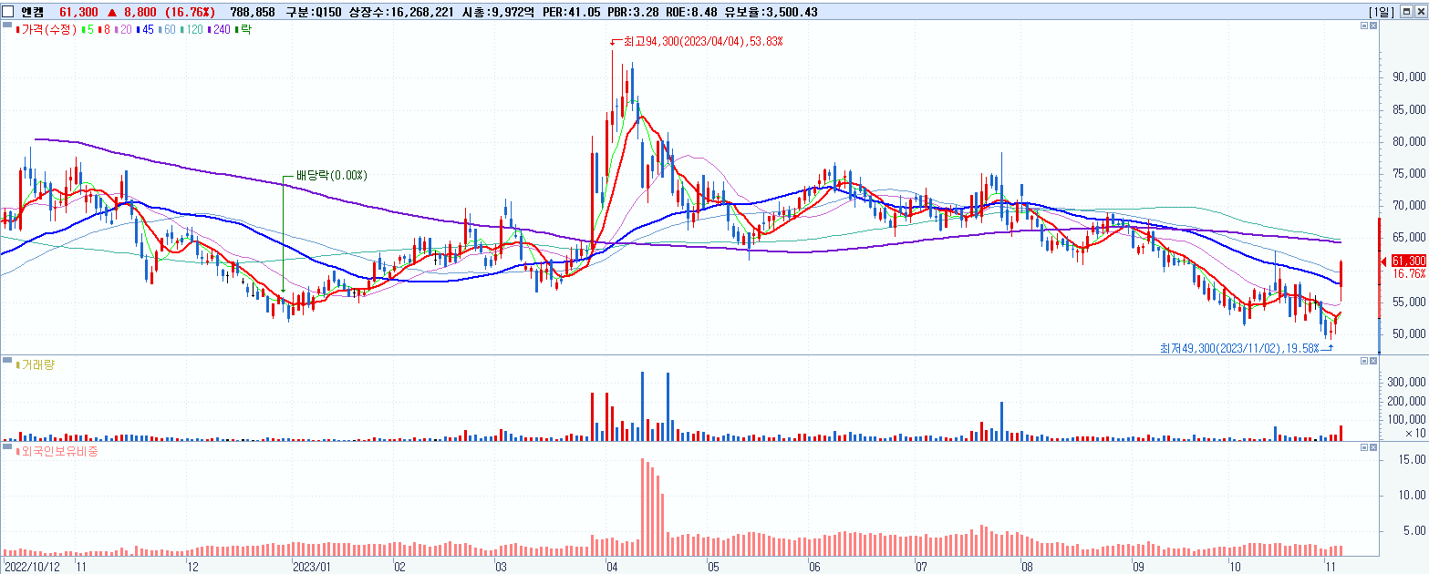 - 엔켐 (61,300원 ▲ 16.76% , 시총: 9,972억, 거래량: 790,257, 거래대금:461억)