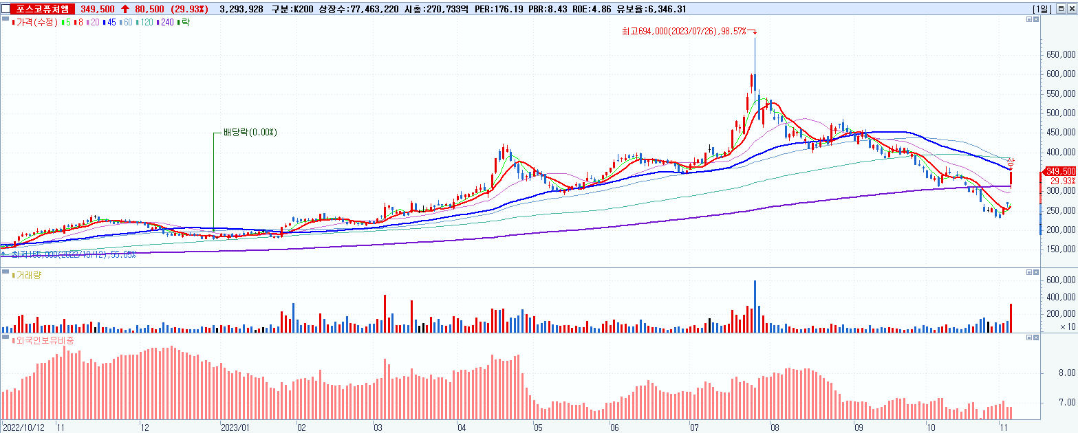 - 포스코퓨처엠 (349,500원 ▲ 29.93% , 시총: 270,734억, 거래량: 3,295,214, 거래대금:10,986억)
