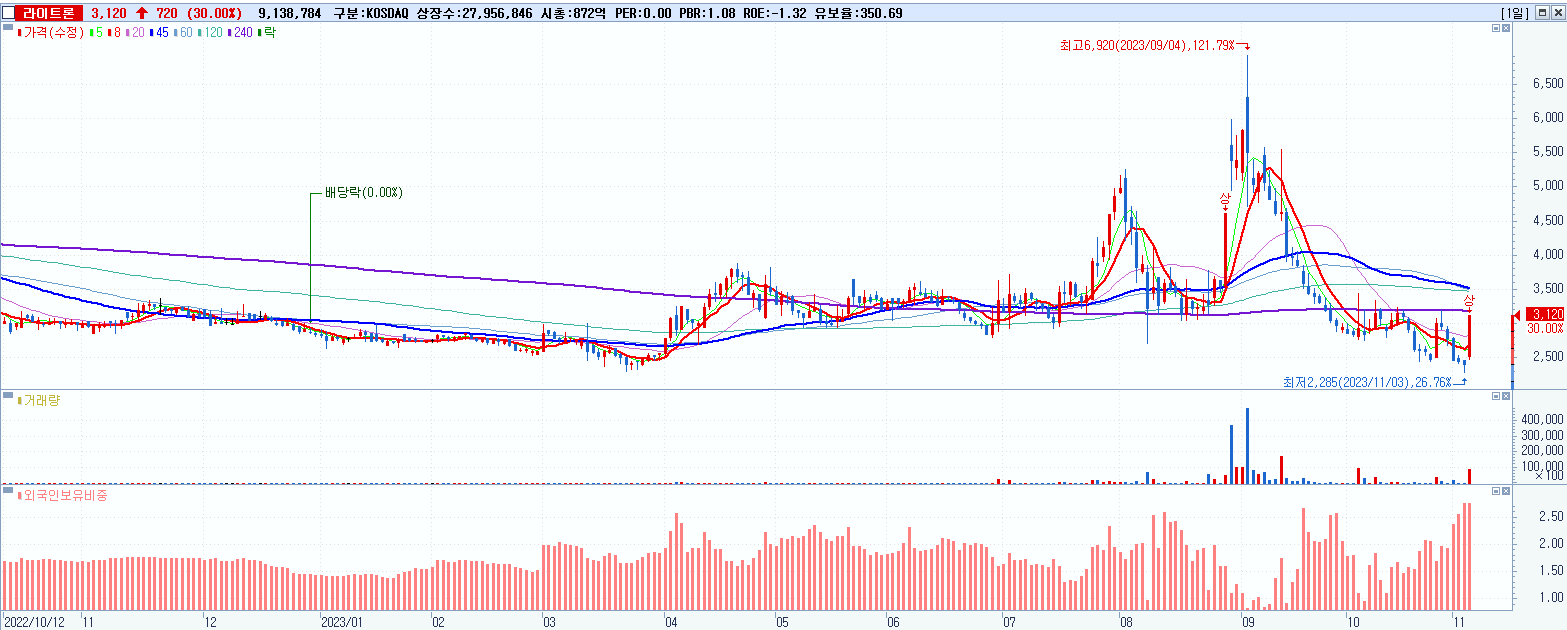 - 라이트론 (3,120원 ▲ 30% , 시총: 872억, 거래량: 9,160,117, 거래대금:268억)