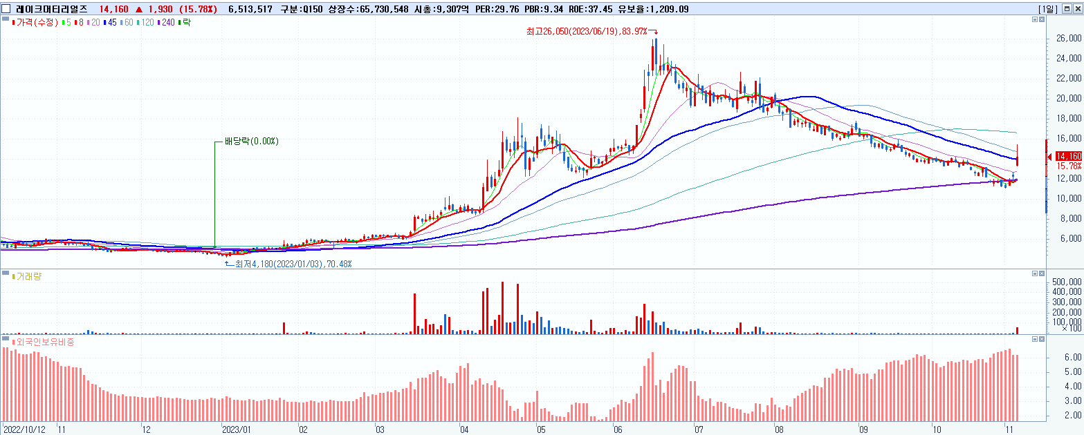 - 레이크머티리얼즈 (14,160원 ▲ 15.78% , 시총: 9,307억, 거래량: 6,531,465, 거래대금:946억)