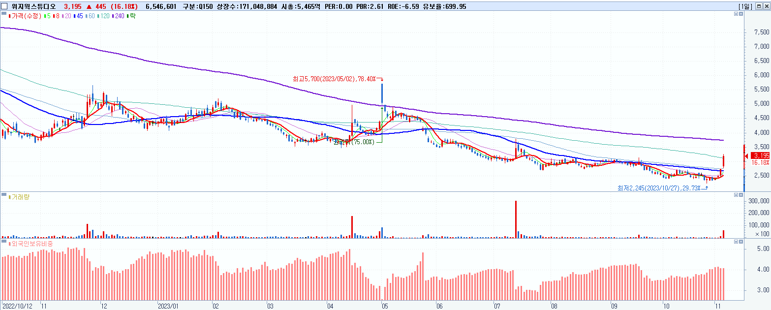- 위지윅스튜디오 (3,195원 ▲ 16.18% , 시총: 5,465억, 거래량: 6,572,573, 거래대금:200억)