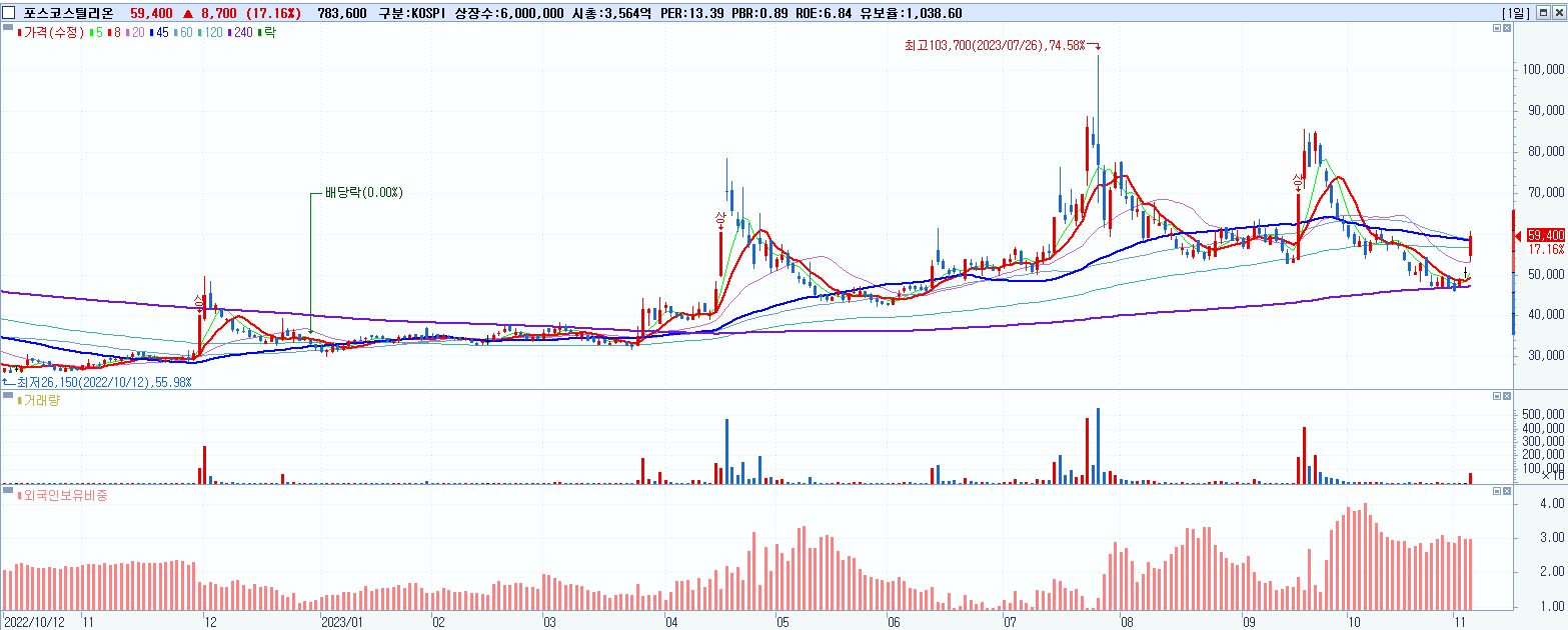 - 포스코스틸리온 (59,400원 ▲ 17.16% , 시총: 3,564억, 거래량: 820,670, 거래대금:476억)