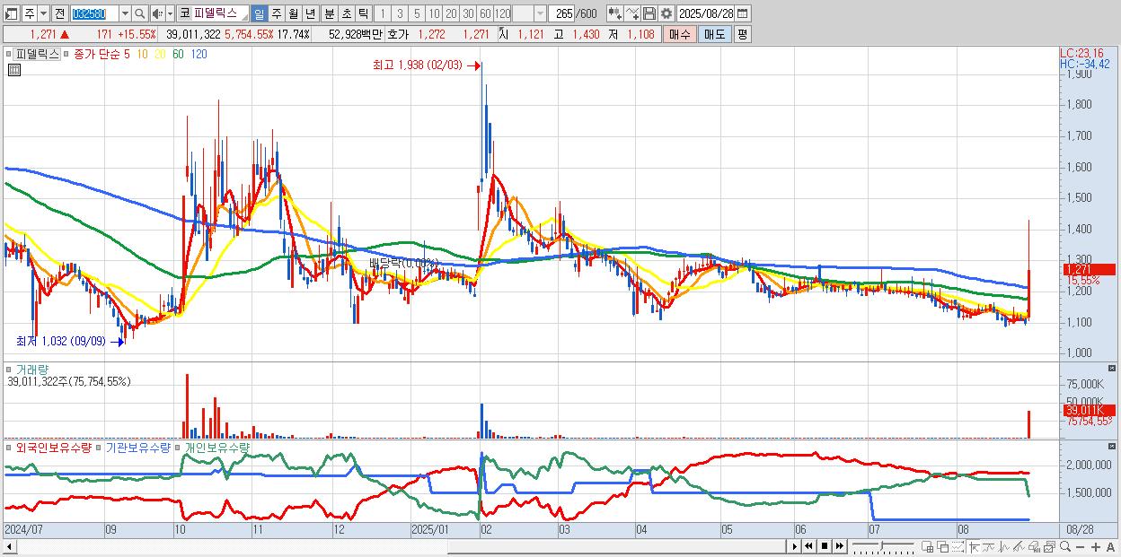 - 피델릭스 (1,271원 ▲ 15.55% , 시총: 421억, 거래량: 39,011,322, 거래대금:529억)