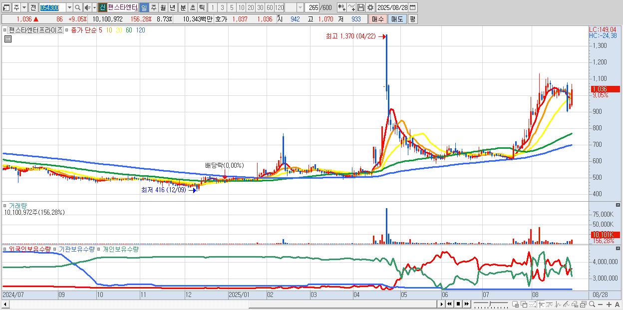 - 팬스타엔터프라이즈 (1,036원 ▲ 9.05% , 시총: 1,199억, 거래량: 10,100,972, 거래대금:103억)