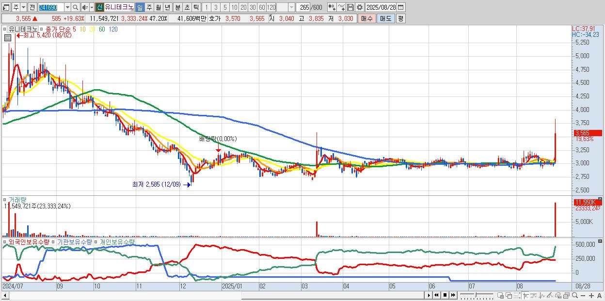 - 유니테크노 (3,565원 ▲ 19.63% , 시총: 872억, 거래량: 11,549,721, 거래대금:416억)