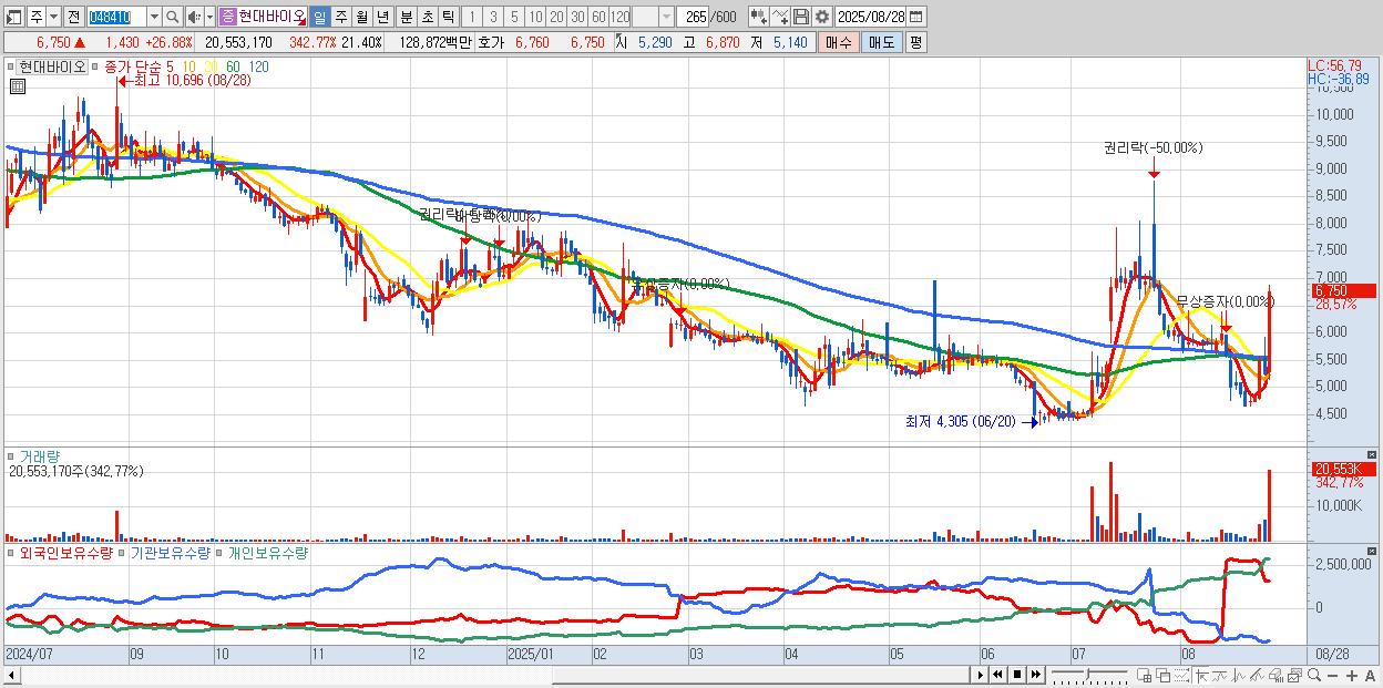 - 현대바이오 (6,660원 ▲ 25.19% , 시총: 6,396억, 거래량: 9,853,912, 거래대금:614억)