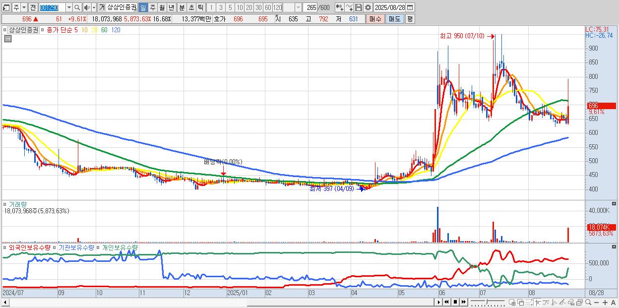 - 상상인증권 (696원 ▲ 9.61% , 시총: 754억, 거래량: 18,073,968, 거래대금:134억)