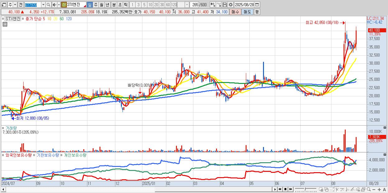 - STX엔진 (40,400원 ▲ 13.01% , 시총: 16,220억, 거래량: 3,899,919, 거래대금:1,527억)