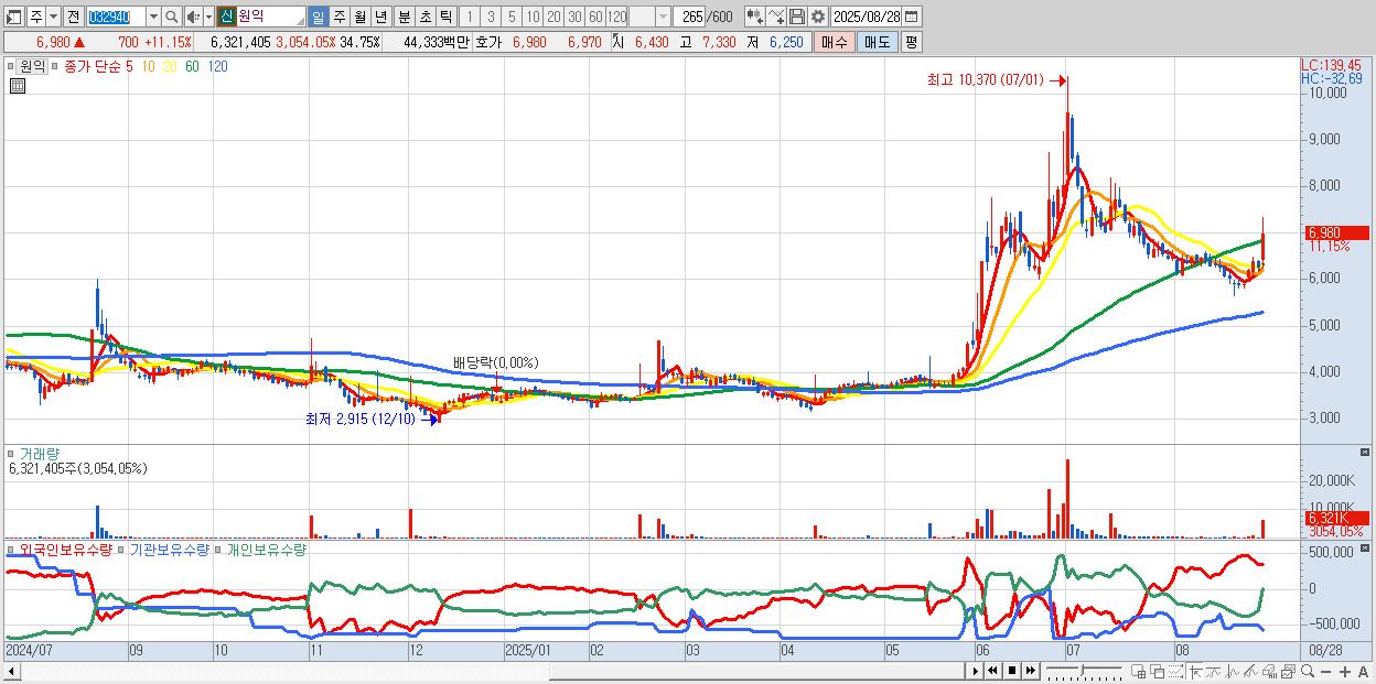 - 원익 (6,980원 ▲ 11.15% , 시총: 1,270억, 거래량: 6,321,405, 거래대금:443억)
