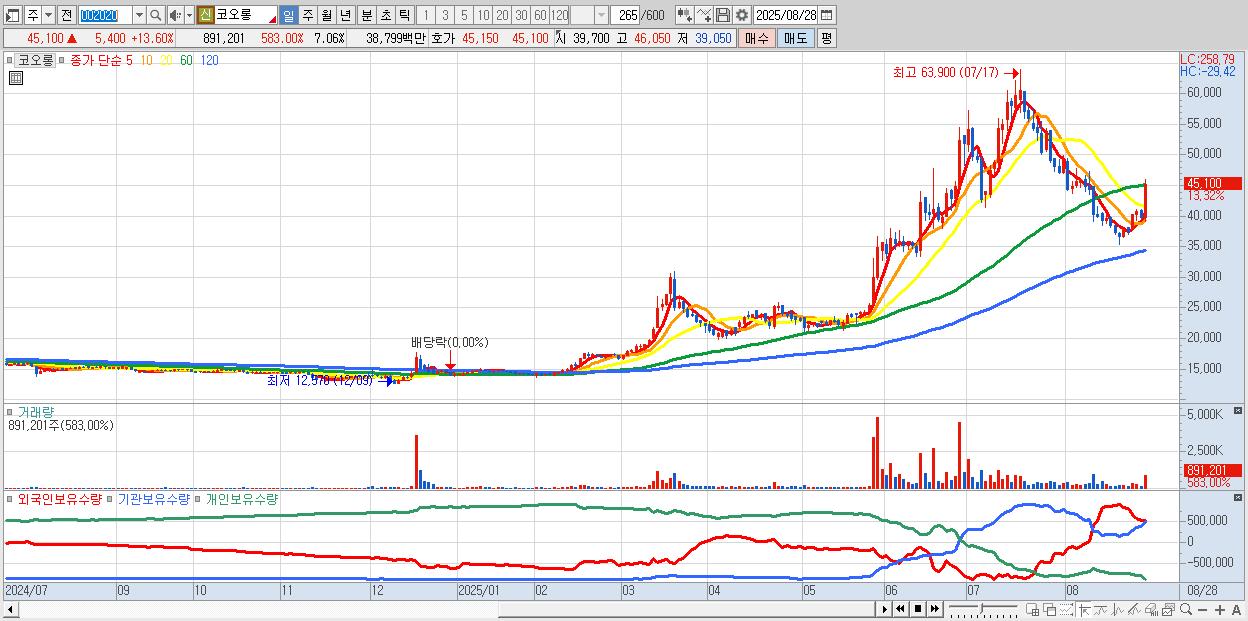 - 콜마홀딩스 (14,450원 ▲ 11.58% , 시총: 4,956억, 거래량: 5,465,297, 거래대금:795억)