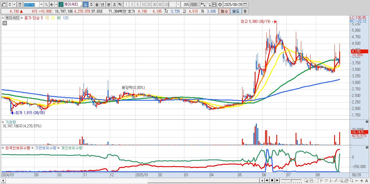 - 케이씨티 (4,190원 ▲ 10.99% , 시총: 719억, 거래량: 16,747,186, 거래대금:714억)