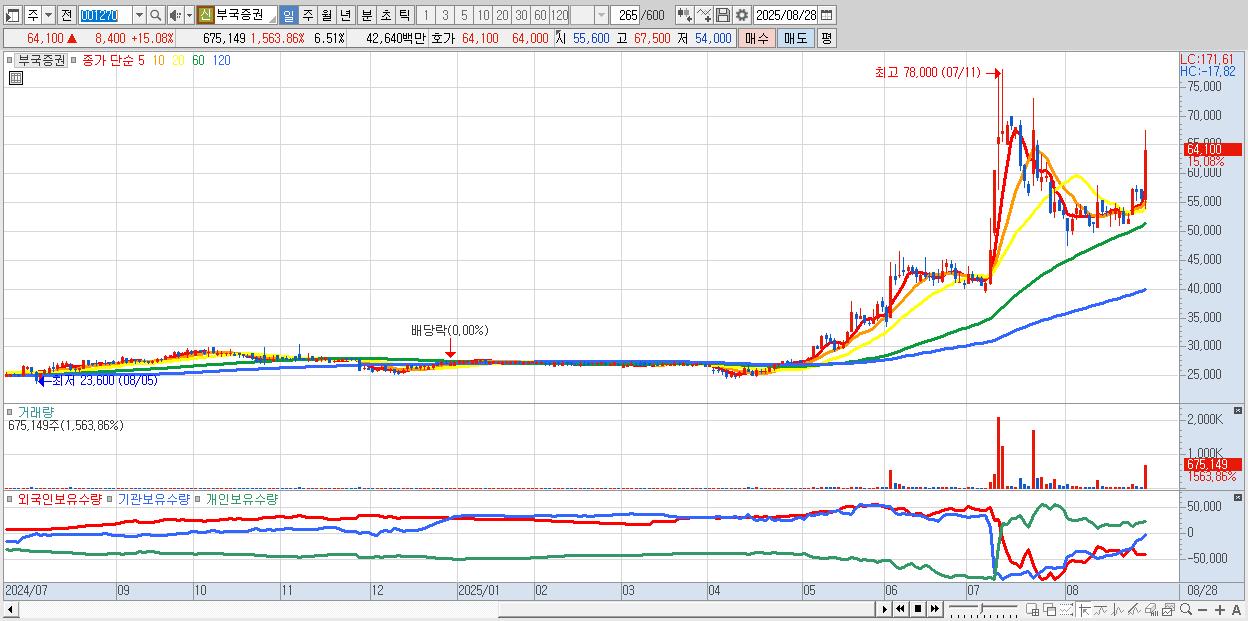 - 부국증권 (64,100원 ▲ 15.08% , 시총: 6,647억, 거래량: 675,149, 거래대금:426억)