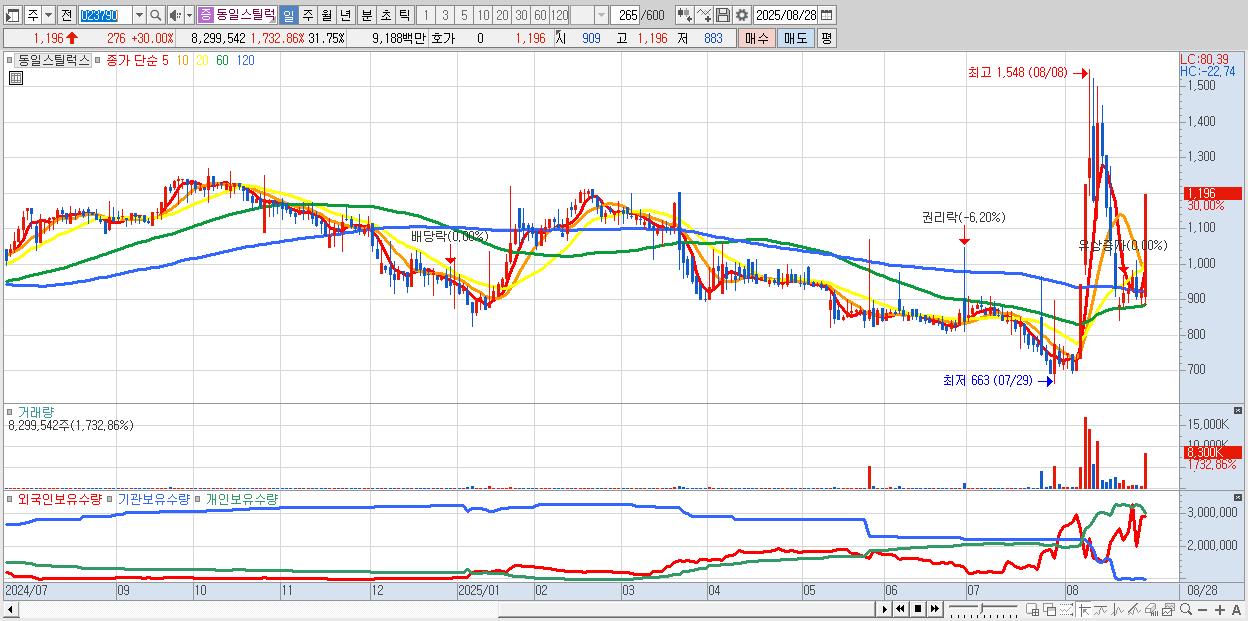 - 동일스틸럭스 (1,196원 ▲ 30% , 시총: 313억, 거래량: 8,299,542, 거래대금:92억)