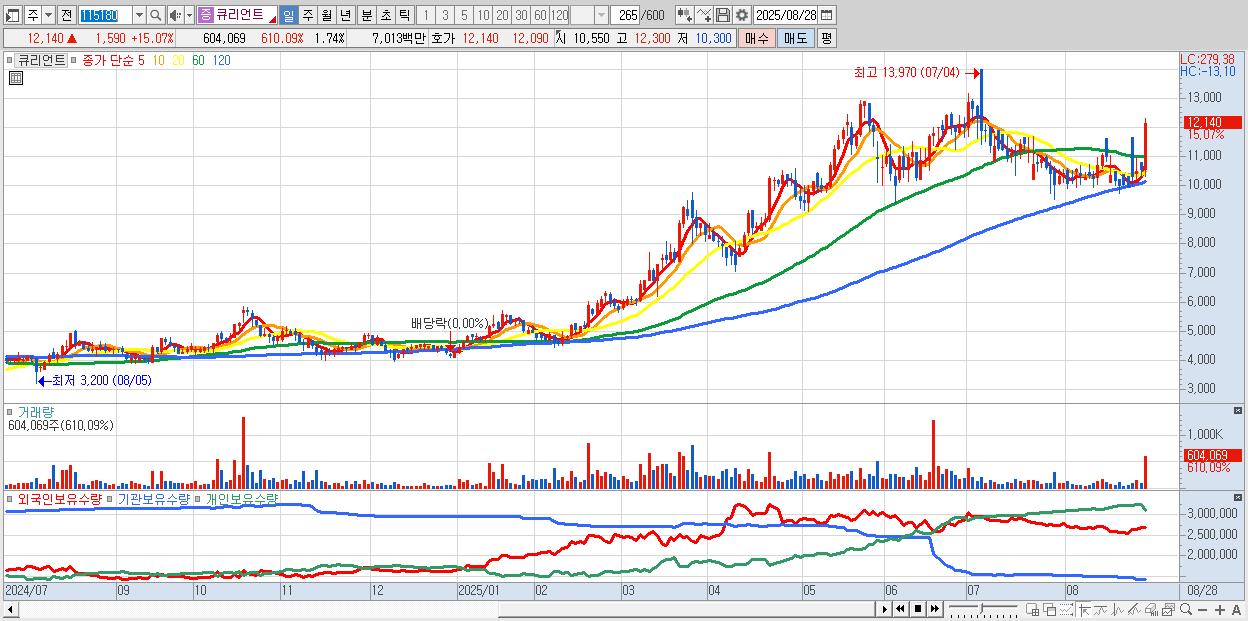- 큐리언트 (12,110원 ▲ 14.79% , 시총: 4,216억, 거래량: 401,149, 거래대금:47억)