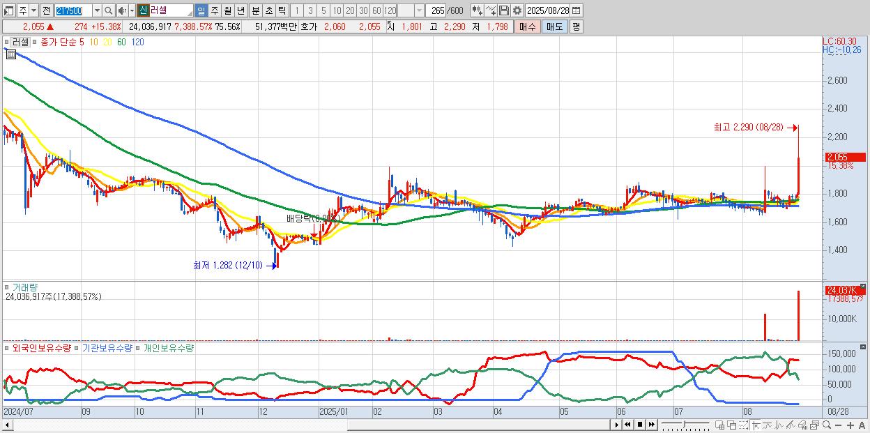 - 러셀 (2,055원 ▲ 15.38% , 시총: 654억, 거래량: 24,036,917, 거래대금:514억)