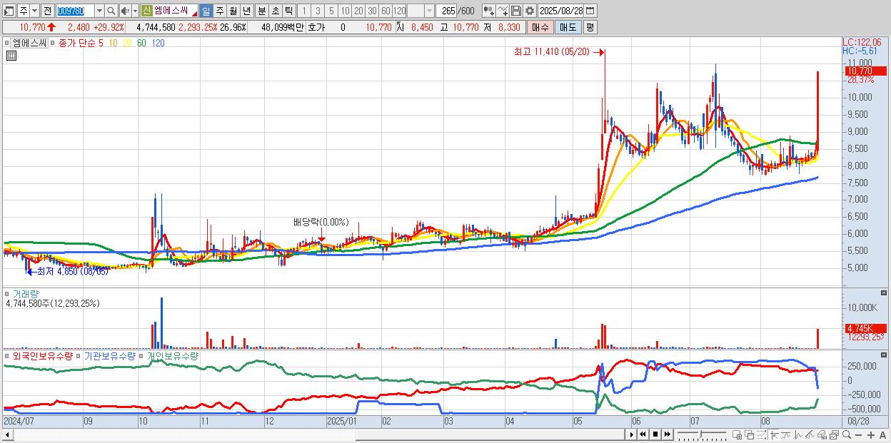 2.엠에스씨 10,770원 ▲ 29.92% (KOSDAQ, 009780)