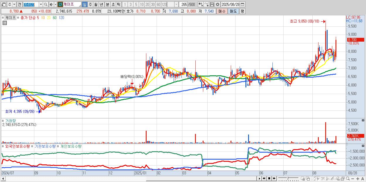 - 케이프 (8,700원 ▲ 10.83% , 시총: 2,688억, 거래량: 2,740,615, 거래대금:231억)