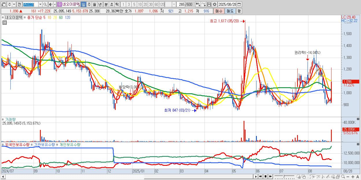 - 네오이뮨텍 (1,096원 ▲ 17.22% , 시총: 1,084억, 거래량: 25,095,149, 거래대금:284억)