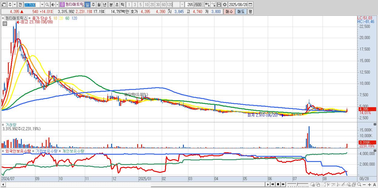 - 퀀타매트릭스 (4,395원 ▲ 14.01% , 시총: 848억, 거래량: 3,315,992, 거래대금:148억)