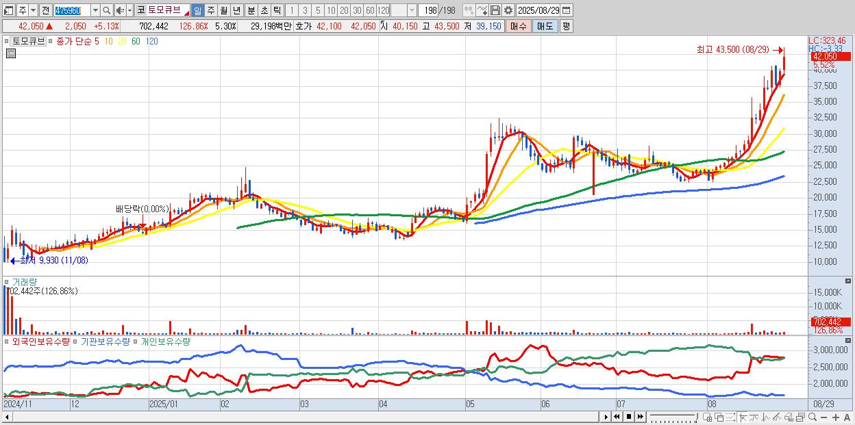 - 토모큐브 (42,300원 ▲ 5.75% , 시총: 5,607억, 거래량: 399,348, 거래대금:166억, KOSDAQ)
