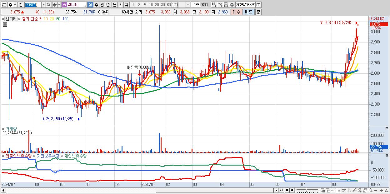 - 엘디티 (3,075원 ▲ 1.32% , 시총: 205억, 거래량: 22,754, 거래대금:1억, KOSDAQ)