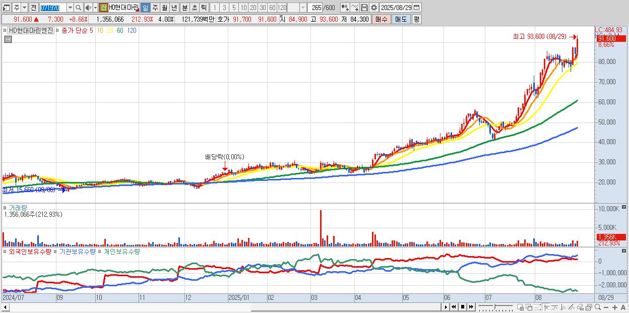 - HD현대마린엔진 (92,000원 ▲ 9.13% , 시총: 31,208억, 거래량: 798,707, 거래대금:718억, KOSPI)