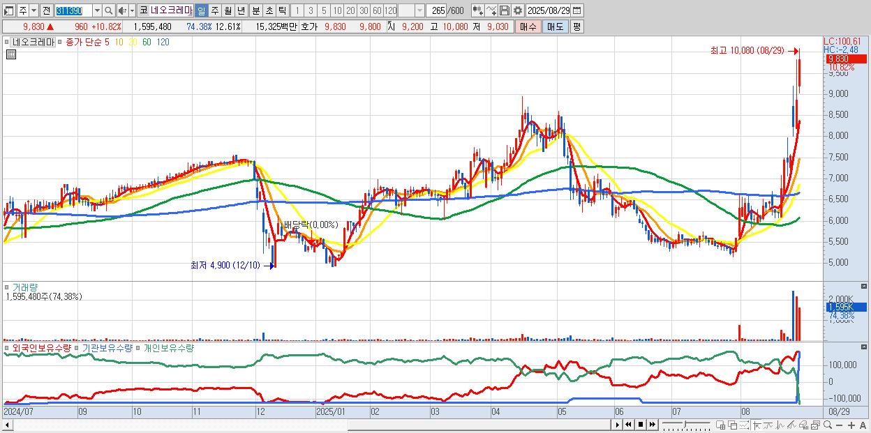 - 네오크레마 (9,830원 ▲ 10.82% , 시총: 1,244억, 거래량: 1,595,480, 거래대금:153억, KOSDAQ)