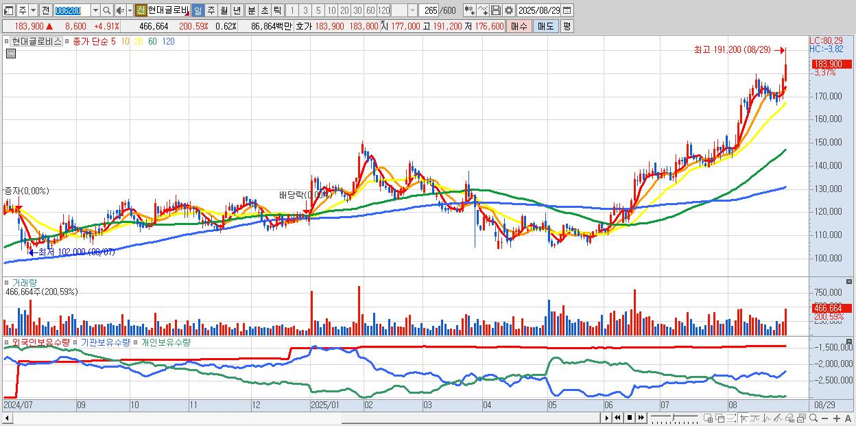 - 현대글로비스 (184,400원 ▲ 5.19% , 시총: 138,300억, 거래량: 371,722, 거래대금:692억, KOSPI)