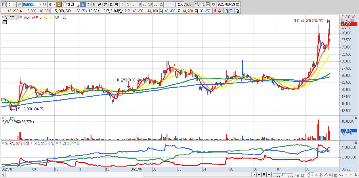 - STX엔진 (43,300원 ▲ 7.18% , 시총: 17,384억, 거래량: 2,704,685, 거래대금:1,164억, KOSPI)