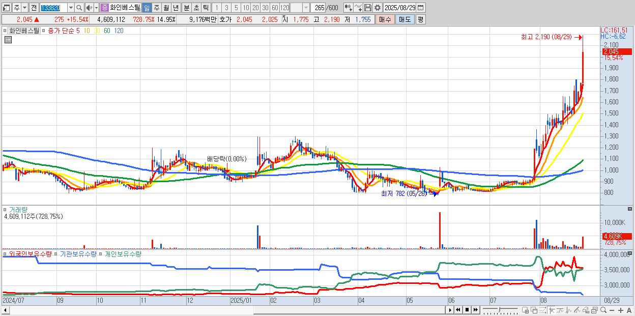 - 화인베스틸 (2,045원 ▲ 15.54% , 시총: 630억, 거래량: 4,609,112, 거래대금:92억, KOSPI)