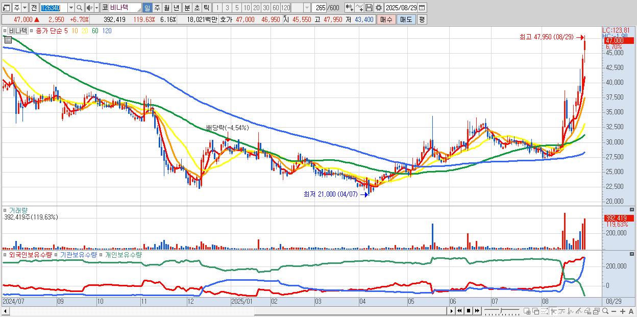 - 비나텍 (47,000원 ▲ 6.7% , 시총: 2,995억, 거래량: 392,419, 거래대금:180억, KOSDAQ)