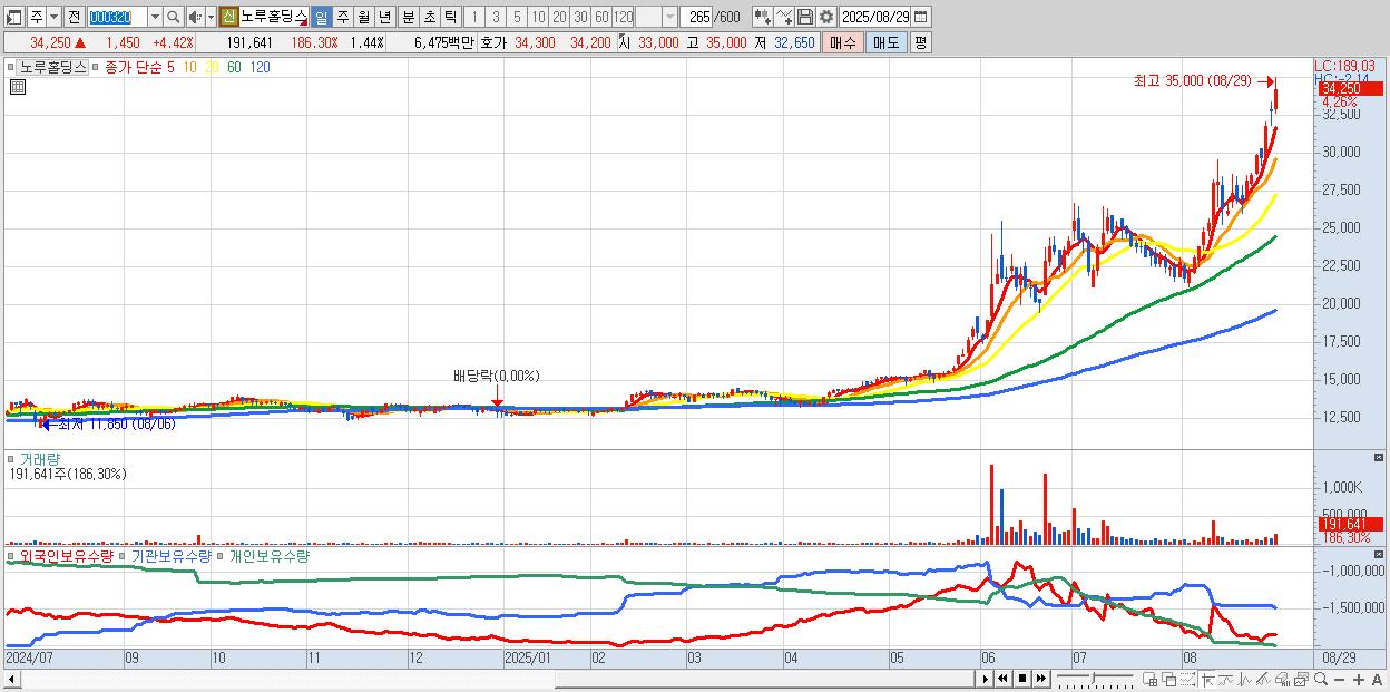- 노루홀딩스 (33,800원 ▲ 3.05% , 시총: 4,492억, 거래량: 135,818, 거래대금:46억, KOSPI)