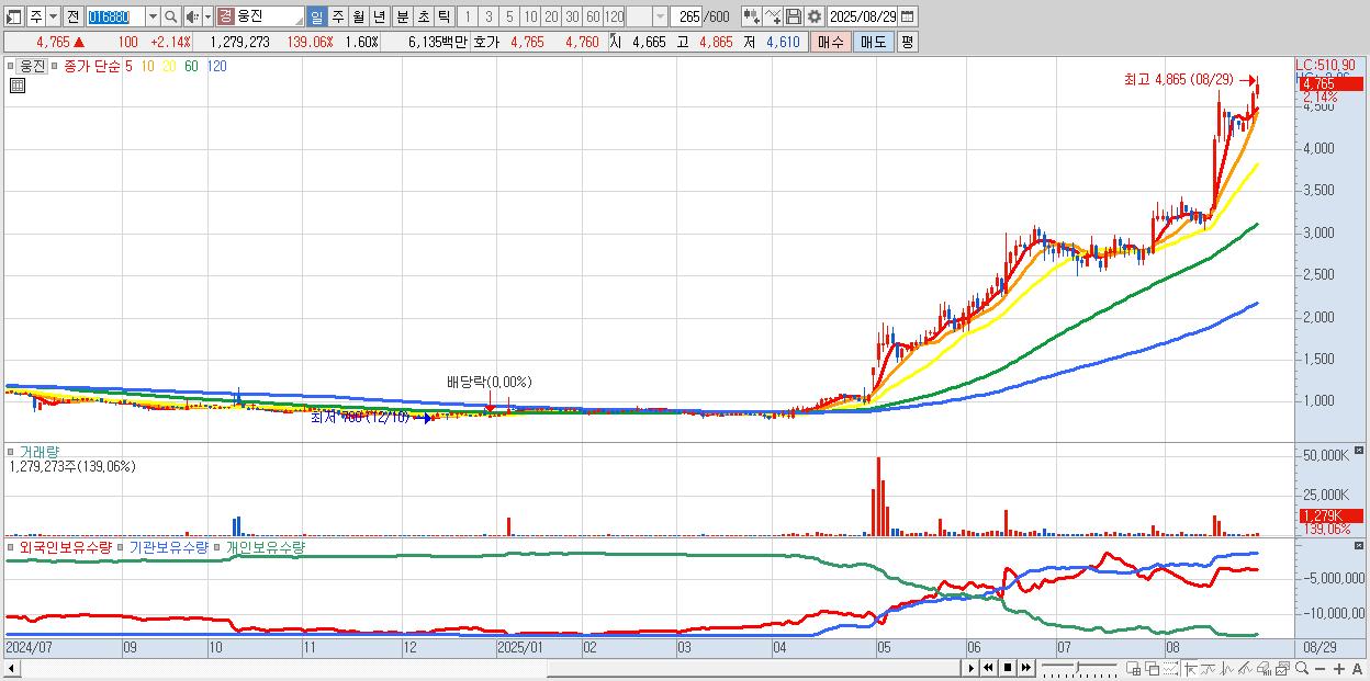 - 웅진 (4,765원 ▲ 2.14% , 시총: 3,809억, 거래량: 1,279,273, 거래대금:61억, KOSPI)