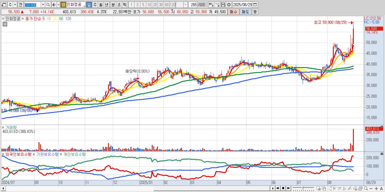 - 인화정공 (56,500원 ▲ 14.14% , 시총: 5,217억, 거래량: 403,613, 거래대금:229억, KOSDAQ)